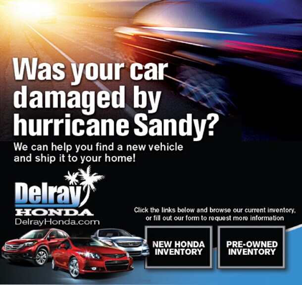 If your car, truck or SUV was damaged by Hurricane Sandy, Delray Honda is here to help you through these difficult times. If you're a resident of the affected areas, including New York, New Jersey, Connecticut and other Northern states, you are eligible to receive discounted shipping on Delray Honda's entire selection of new 2013 Hondas. And for every vehicle purchased by our friends and neighbors to the north, Delray Honda will donate $100 to the American Red Cross for Hurricane Sandy relief.
